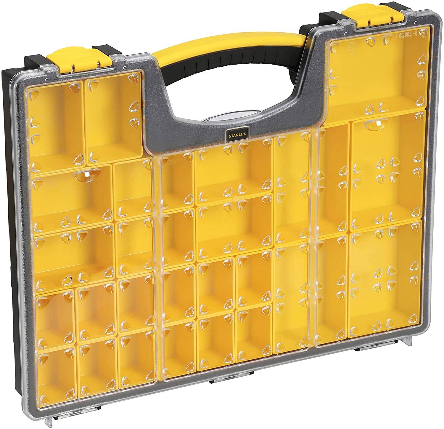 Профессиональный кейс под содержание элементов крепежа и приборов с небольшими габаритами. Изготовлен из прочной пластмассы, в наличии 25 отсеков. Замки выполнены из пластмассы, присутствует эргономичная ручка для удобной переноски органайзера. Габариты изделия равны 42.2 на 33.4 на 5.2 см., при весе в 1.3 кг.