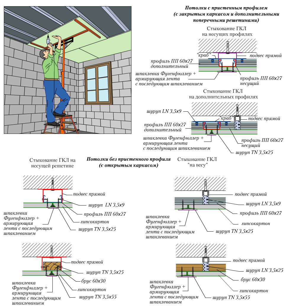 Монтаж гипсокартонной конструкции схож с обшивкой потолка пластиковыми панелями. Главное отличие состоит в том, что профили для крепления листов ГКЛ располагают с шагом в 60 см. Это нужно, чтобы стык соседних листов пришелся на середину потолочного профиля.