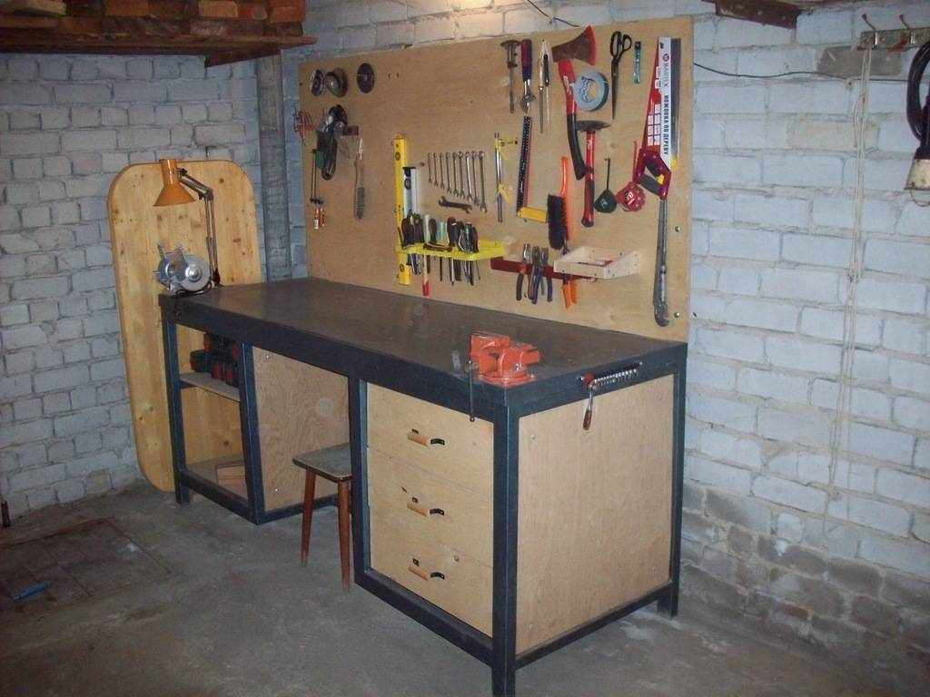 Чаще всего в гаражах самостоятельно изготавливается простая стационарная конструкция, расположенная вдоль одной или двух стен. В последнем случае она может считаться угловой.