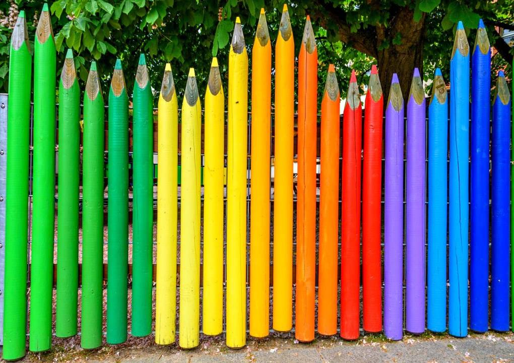 - при создании яркого варианта деревянные планки можно покрасить несколькими цветами. Например, сделать ограждение в виде цветных карандашей.