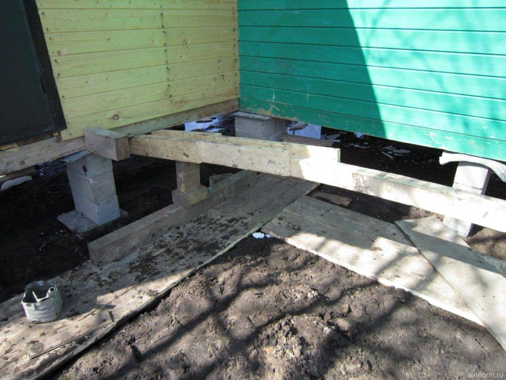 - Домкрат устанавливается в углу, на доске. Далее поочередно на инструмент укладывают: уголок, кусок специальной металлической трубы и металлическую балку. Швеллер устанавливается так, чтобы упор был на ребро жесткости основания постройки.