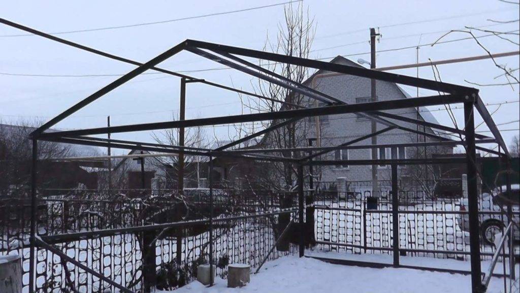 Каркас собирают на ровной поверхности или возводят на готовом фундаменте. Элементы конструкции соединяют сваркой либо при помощи заклепок и болтов. Профиль нарезают по размерам согласно проекту. Сечение для несущих труб и горизонтальных перекрытий – 40 мм, для труб обвязки – 20 мм. Привариваются четырехугольный каркас для навесных ворот. С одной из сторон необходимо сделать дверной проем. Можно предусмотреть и окна.
