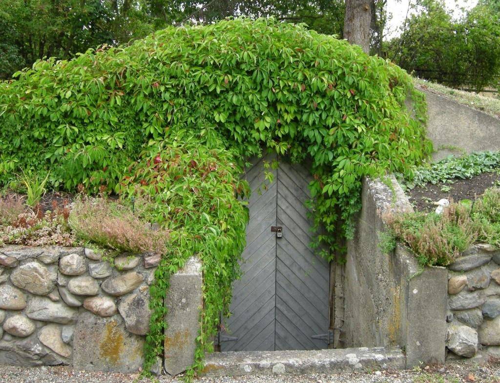 Из глубокой старины пришла конструкция наземного погреба. Устанавливают его в места с высоким уровнем грунтовых вод. Конструктивно он представляет собой помещение с углубленным в грунт на 50-100 см полом. Толстые стены не дают холоду добраться до овощей, на крышу нередко укладывают слой дерна. Для входа в наземный погреб делают тамбур.