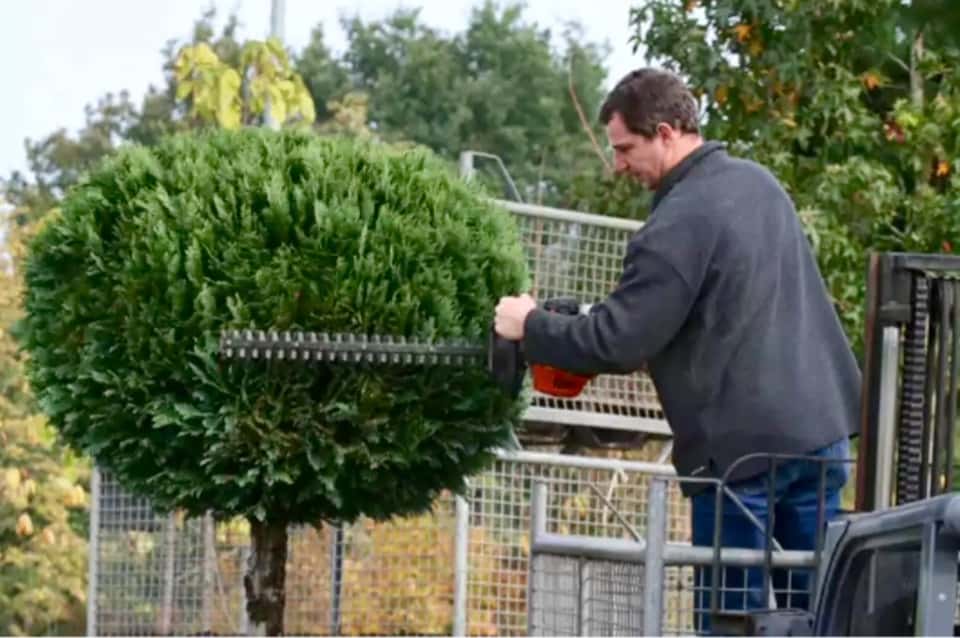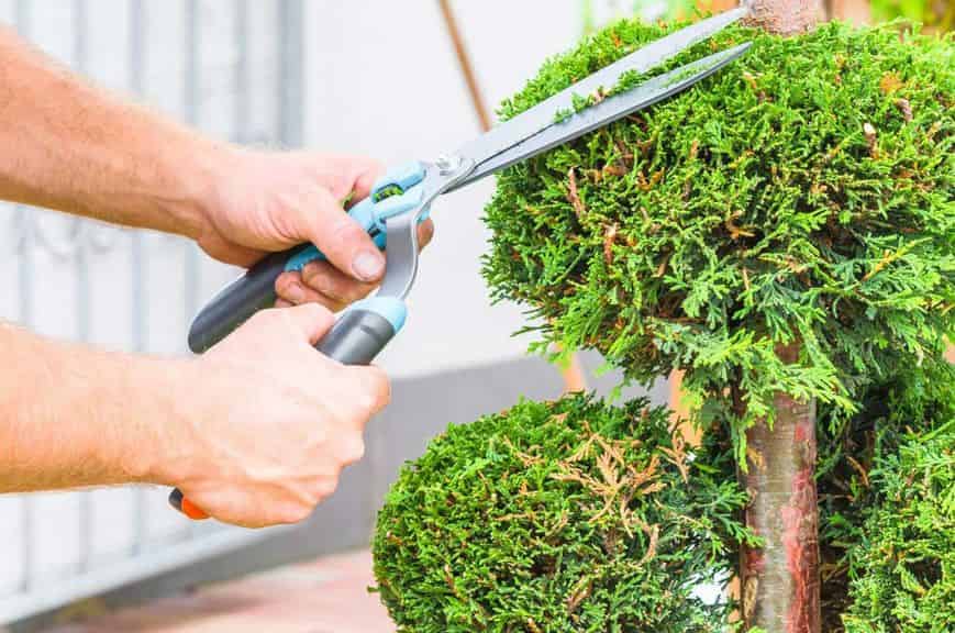 Небольшая толщина и гибкость габитуса при обрезке не создают препятствий для лезвий секатора — главное, чтобы инструмент был заточен, иначе легко травмировать дерево. Длина ручек садовых ножниц дотянется до любой высоты, серпу поддастся древесина крупных веток. Смола хвойных может вызвать аллергию и плохо отмывается с кожи, поэтому используйте рабочие перчатки и защитную одежду. Если вы являетесь владельцем обширных туевых насаждений или задумали несколько замысловатых фигур из кустарников, стоит серьёзней подготовиться к их обрезке.