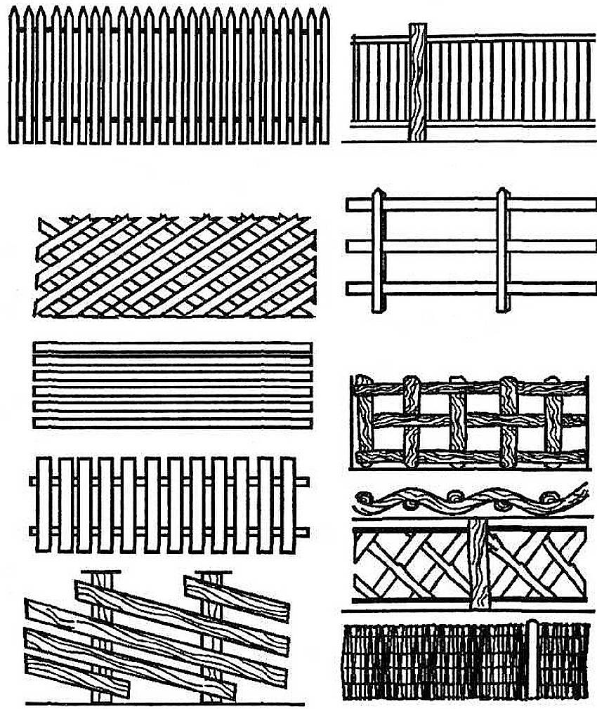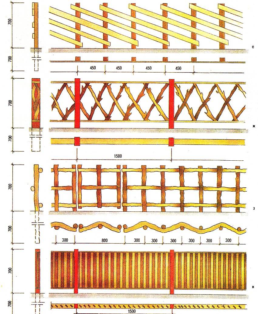 Примеры конструкции деревянных изгородей, их монтажные размеры