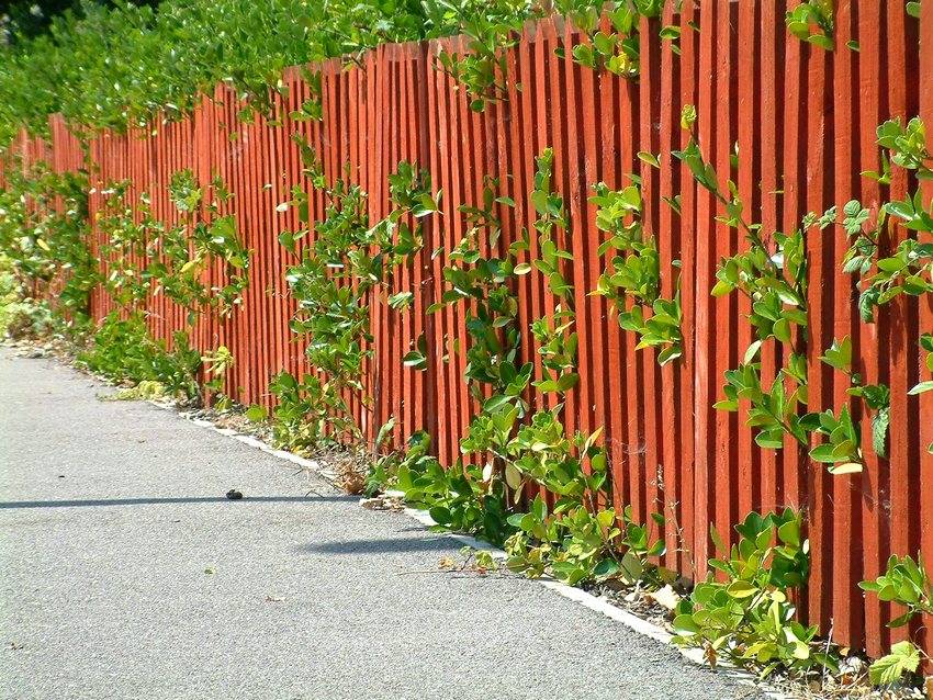 Стильный деревянный забор украшают вьющиеся растения