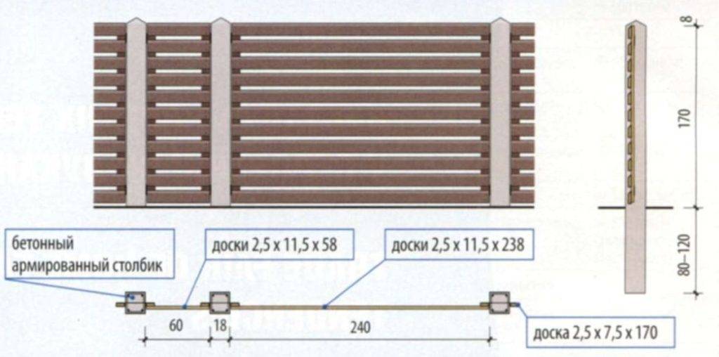 В качестве опорных стоек могут использоваться металлические, бетонные или деревянные столбы. Высота забора колеблется от 1,5 до 2 м. Горизонтально ориентированные ламели располагаются под углом, рекомендуемое расстояние между ними 15-20 мм. Подготавливается фундамент, в котором бетонируются опорные стойки.