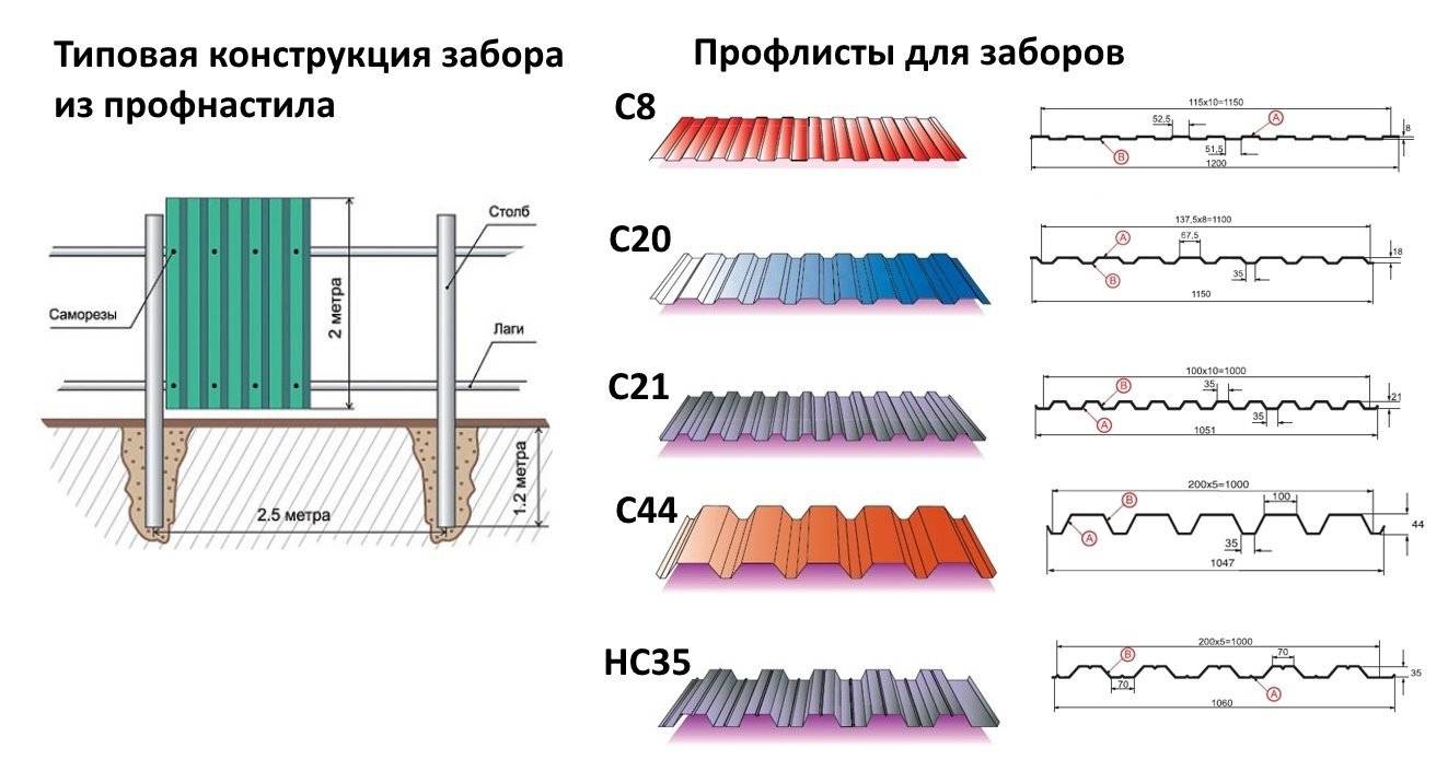 Для заборов, как правило, применяют профнастил марок С8, С10, С15… С20. Потому что использование профилированного листа с профилем более 20 мм экономически невыгодно. Он значительно дороже и тяжелее, так как его площадь возрастает из-за рельефа.
