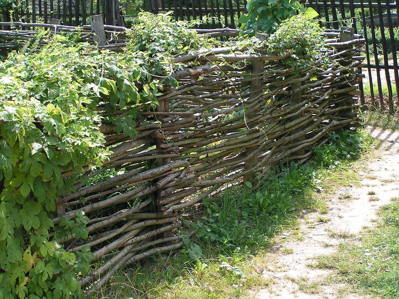 - Высокие плетни достигают 2 м в высоту. Если вы изготовите столбы из кирпича или камня, а для пролётов возьмёте достаточно толстые ветки (от 2 см в диаметре и более), то такая конструкция может считаться капитальной.