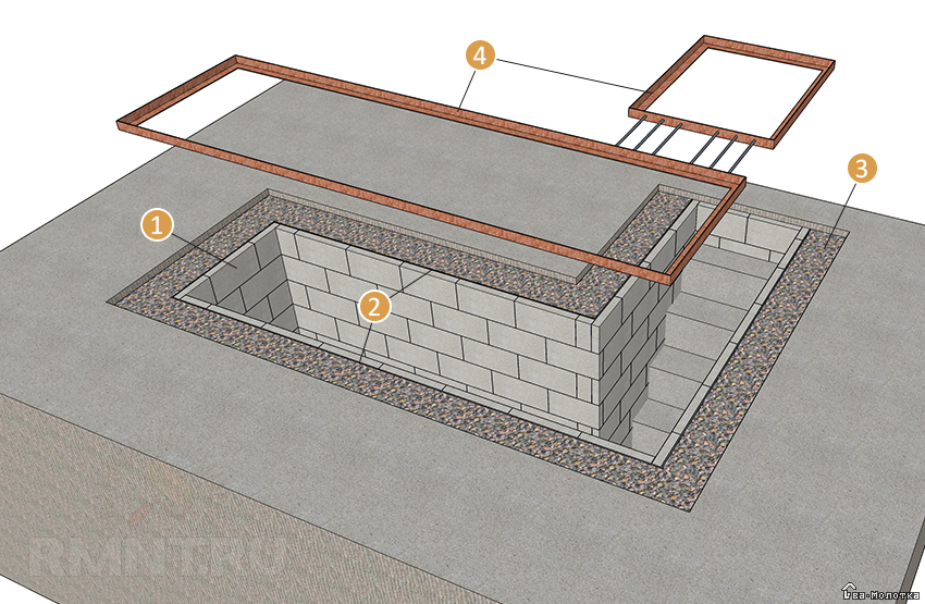 Из бетона с маркой 150-200 выполняется днище, толщина которого составляет примерно 100 мм. Это тоже отражается на глубине котлована.