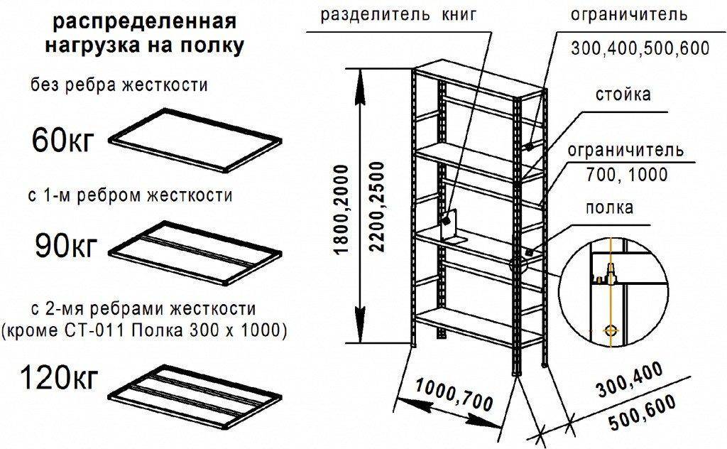 Чертёж металлического стеллажа и максимально допустимые нагрузки на него