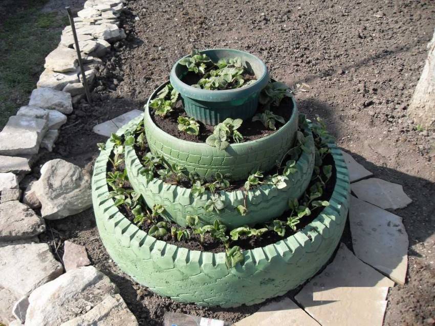 Существует множество идей грядок для клубники вертикального исполнения, к примеру, посадка саженцев в мешки с прорезями. Большой популярностью пользуются пирамидальные конструкции, для изготовления которых применяют обработанные антисептиком доски. Можно использовать и автопокрышки разного диаметра для изготовления грядок под клубнику, что смотрится довольно оригинально. Если применяются трубы, то по спирали делают отверстия нужного размера. Достоинство вертикальных конструкций заключается в экономии места на приусадебном участке, высокой декоративности в период цветения и плодоношения ягодной культуры.