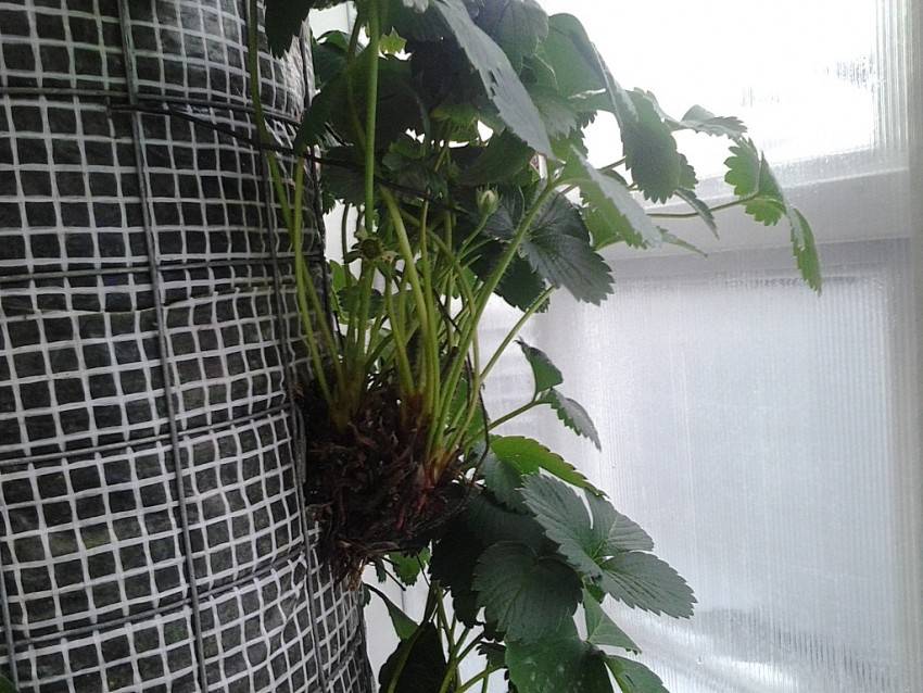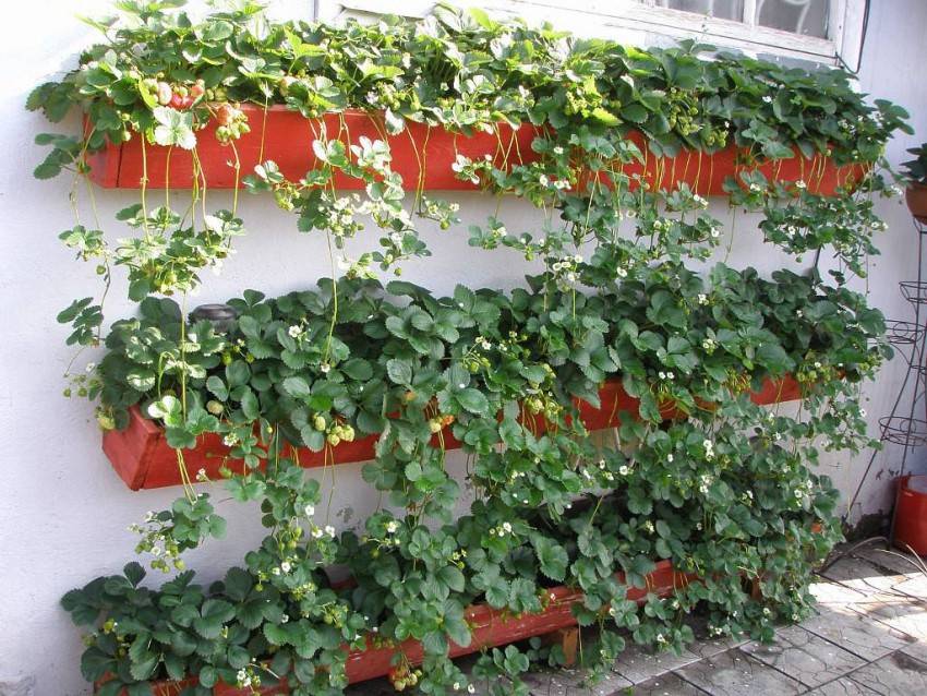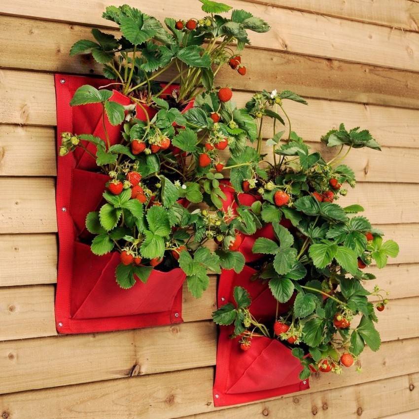 Подвесные конструкции — хорошее решение для вьющихся сортов клубники Такие грядки схожи с вертикальными, однако в этом случае они не устанавливаются, а подвешиваются. При этом куст высаживают корнями вверх
