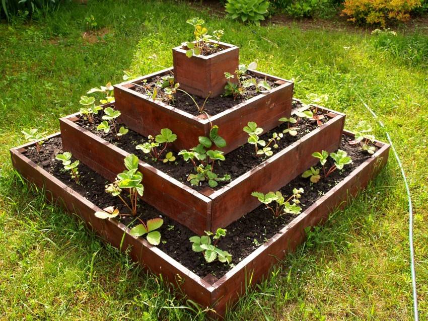 Пирамиды для клубники являются чем-то средним между высокими и вертикальными грядками под клубнику. Сделать их несложно своими руками.