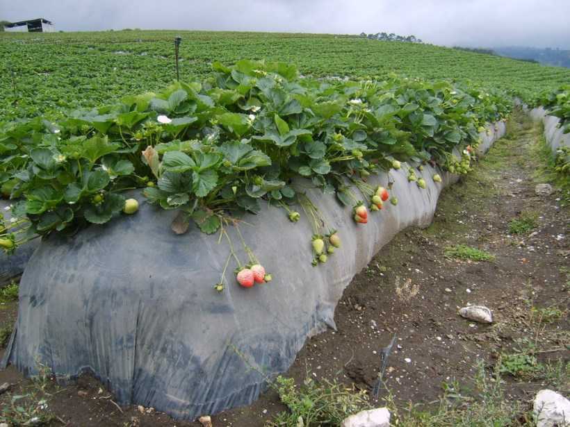 Также обрабатывать потребуется и проходы между рядами от сорной растительности. Еще есть риск заражения клубники различного рода заболеваниями. Как вариант, можно высаживать кусты на гряды укрывного типа, тоже горизонтальные. Для ее изготовления применяют черный пленочный материал либо другое волокно, препятствующее росту и развитию проблемных растений. Несмотря на сложность обустройства такой грядки, выращивание клубники становится вполне оправданным занятием, к тому же материал способен прослужить не один год.