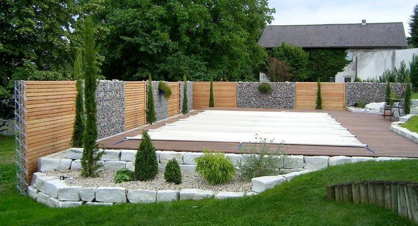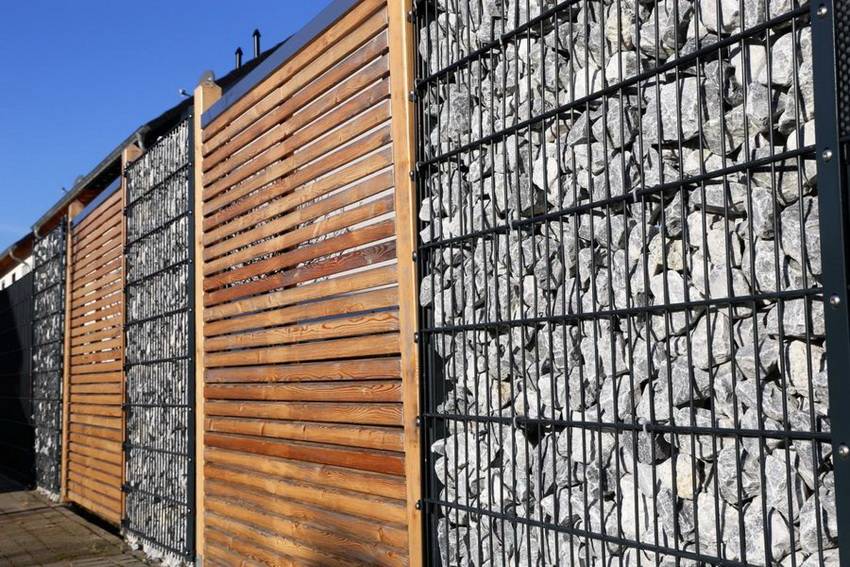 Если вы относитесь к ценителям оригинальных идей, то рекомендуем вам ознакомиться с габионами, как материалом для изготовления заборов. Это своего рода насыпные ограждения, сохраняющие природную привлекательность внутреннего наполнителя, например, камня или дерева. Такие ограждения отлично сочетаются с декоративными цветами и газонами.