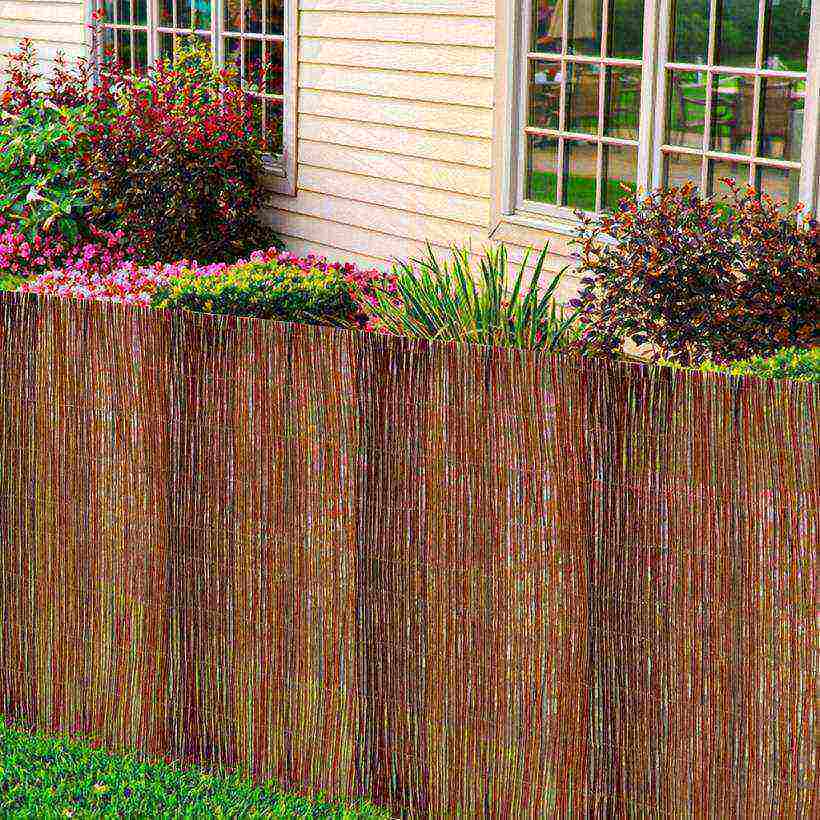 Изгородь из камыша делают невысокой, как бордюр, ограждая цветники, клумбы.