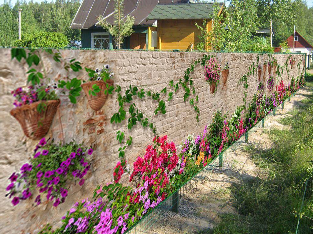 Растения можно не только посадить, но и повесить! Вертикальным садом называются цветочные горшки и кашпо, которые вешаются на сетку-рабицу за крючки, хомутами или при помощи проволоки. В таком саду можно посадить любые цветы, даже комнатные, если лето тёплое. Недорого, просто и очень красиво, особенно когда саженцы разрастутся.