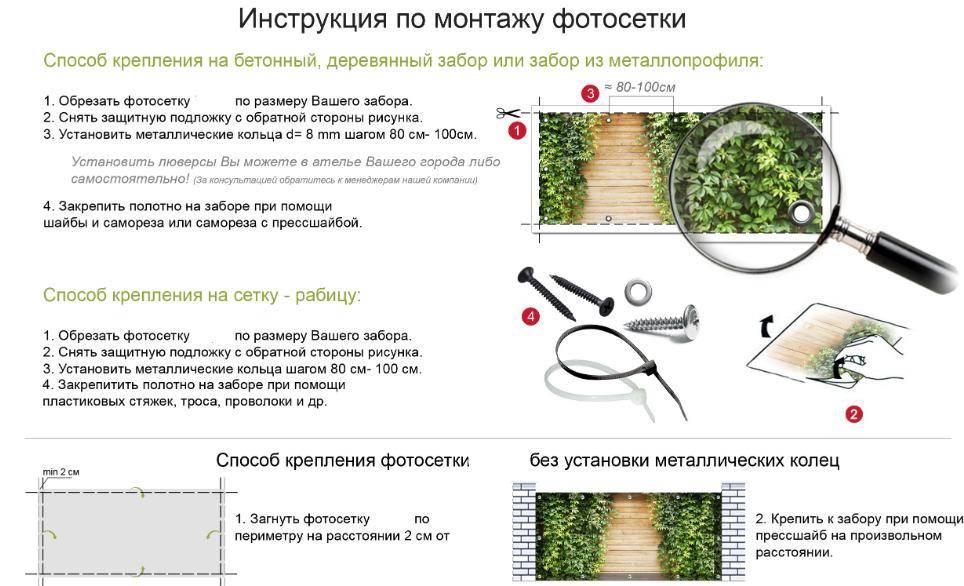 Устанавливать фотосетку на ограждения можно самостоятельно или используя помощь специалистов. Существует несколько способов монтажа материала.