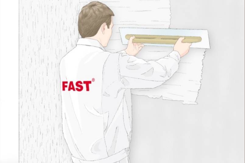 С помощью стальной терки нанести штукатурку тонким слоем на толщину зерна. Затем следует сгладить поверхность, собирая лишний материал. Через некоторое время, в зависимости от условий, возникающих в процессе нанесения, мы затираем штукатурку с помощью пластмассовой терки. Для того, чтобы избежать видимой линии соприкосновения между свежим и уже затвердевшим слоем штукатурки необходимо обеспечить достаточное количество работников и строительных лесов. Во время нанесения декоративной штукатурки, избегайте перерывов во время нанесения слоя и придерживаясь главного правила „мокрое на мокрое”. Из-за повышенного поглощения теплового и ультрафиолетового излучения на фасадах расположенных на юг и запад, не рекомендуется использовать темные цвета; количество таких цветов на поверхности фасада не должна превышать 10%.