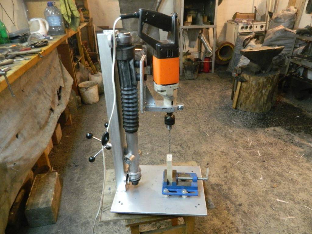 Совет. Если вы хотите контролировать глубину сверления, желательно дополнительно оснастить конструкцию быстрозажимным фиксатором. Он будет играть роль ограничителя движения дрели. Все описанные работы у более-менее опытного домашнего мастера не вызовут ни малейших проблем. А в итоге мы получим удобное в эксплуатации и очень полезное самодельное оборудование.