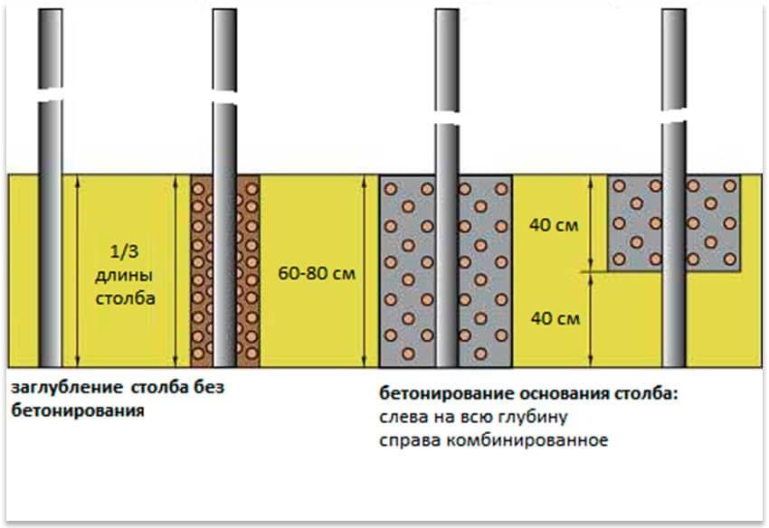 Есть разные рекомендации по размеру подземной части. Для слабых грунтов и сплошных пролетов с высокой парусностью обычно советуют около 50% от высоты надземной части. Для пучинистых грунтов, способных «выдавливать» из себя опоры, глубина установки столбов должна быть на 20-30 см ниже уровня промерзания. И в некоторых случаях эта величина может быть больше расчетной.