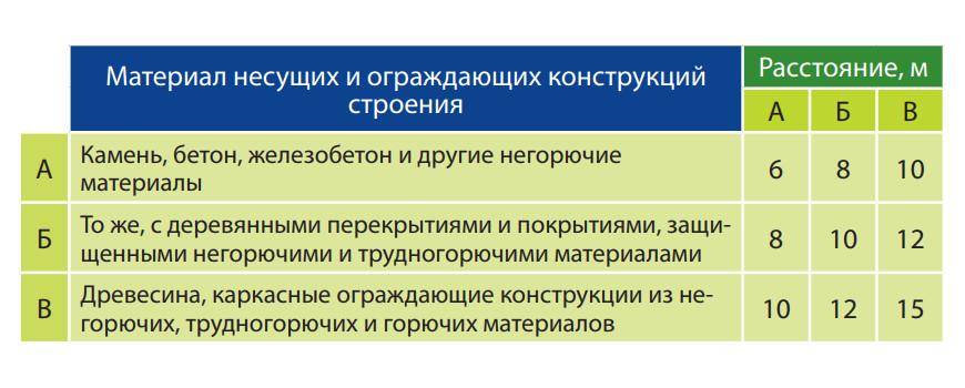 Противопожарные расстояния указаны в таблице ниже и зависят от материалов, из которых выполнена постройка. Примечательно, что в пределах одного участка эти расстояния не нормируются.