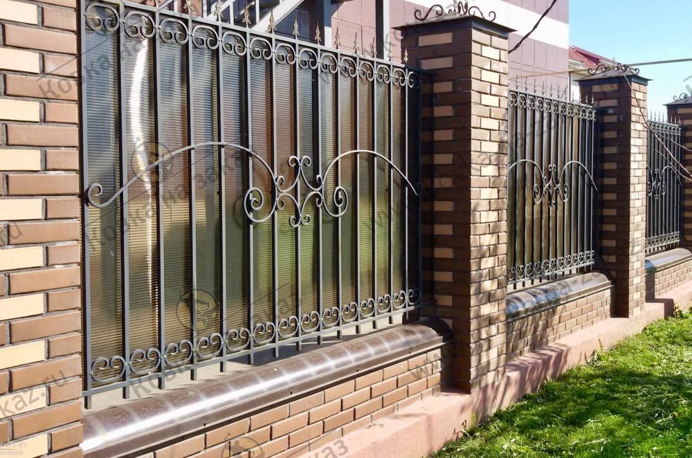 Дорогостоящий, но очень декоративный вариант, который прекрасно сочетается с кирпичными опорами. Секции выполняются под заказ, а потому есть возможность создать уникальный орнамент.