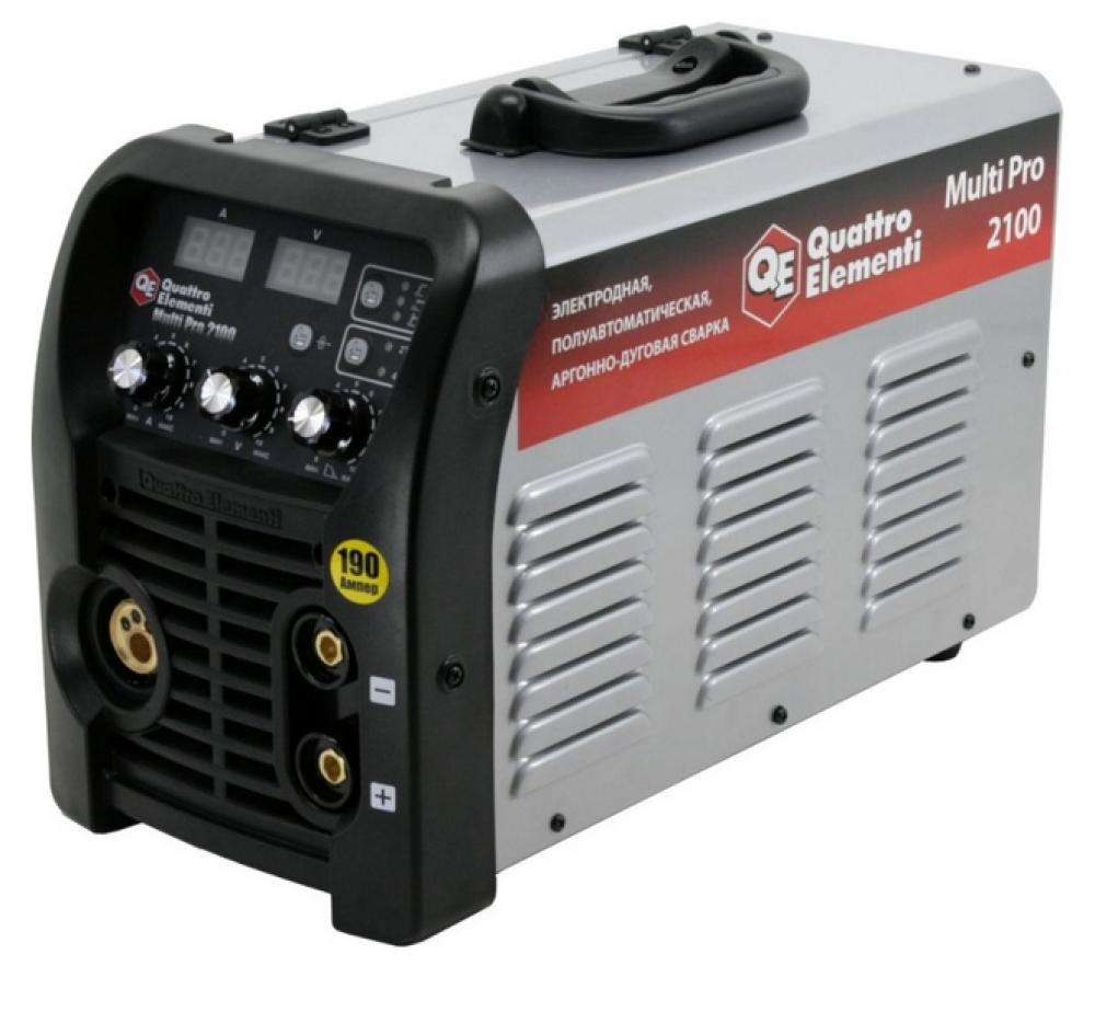 Этот сварочный аппарат можно использовать для ручной и полуавтоматической сварки. Внутреннее размещение обеспечивает защиту катушки от повреждений. Постоянный ток стабилен при напряжении источника питания от 185 до 240 V. Quattro Elementi MultiPro 2100 – один из лучших сварочных инверторов рейтинга по надежности. Отдельно следует отметить хорошую фиксацию электрода штатным держателем. Для комфорта пользователя элементы управления и контроля инвертора сгруппированы в одной зоне. Специальное углубление панели предотвращает случайное механическое повреждение. Электрические разъемы защищены от влаги. Производительные вентиляторы поддерживают оптимальный температурный режим блока электроники, тем самым предотвращая перегрев при выполнения длительных рабочих циклов.
