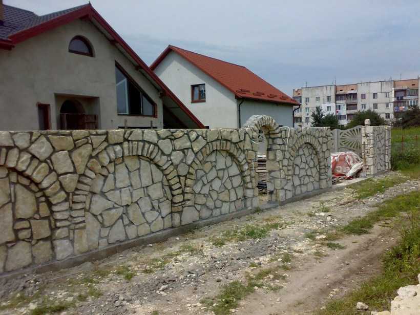 - забор из французского камня или искусственного. Французским камнем называют пустотелые шлакоблоки, изготовленные способом вибропрессовки. Потом шлакоблоки обрабатывают специальными влагоустойчивыми составами. Забор из искусственного камня имеет вид натурального и обладает рядом преимуществ: многообразие расцветок, меньший вес, стандартный размер.