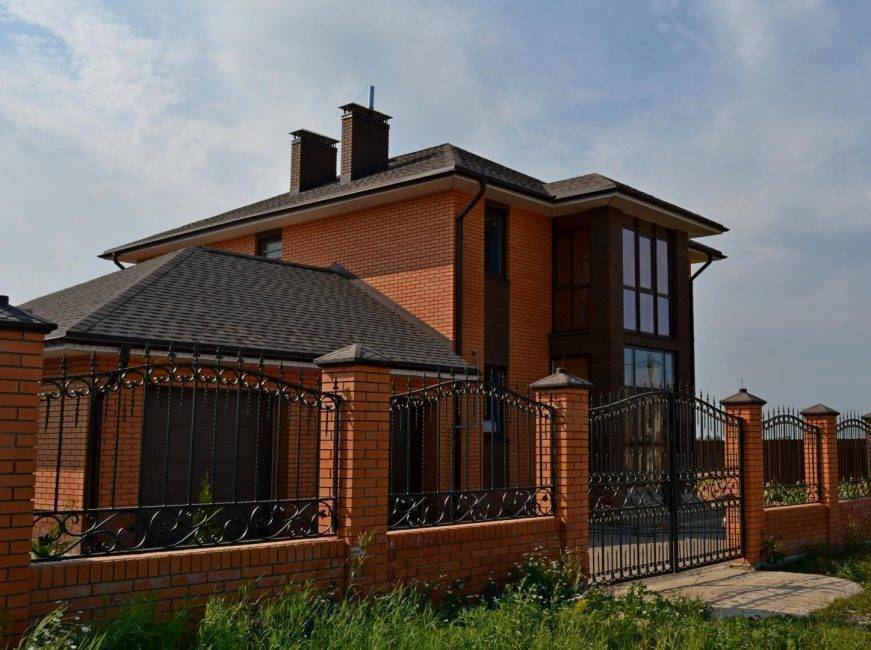 Очень часто кирпичный забор строят не в «чистом» виде, а в комбинации — часть пролета из кирпича, а остальное ограждение из металлической решетки.