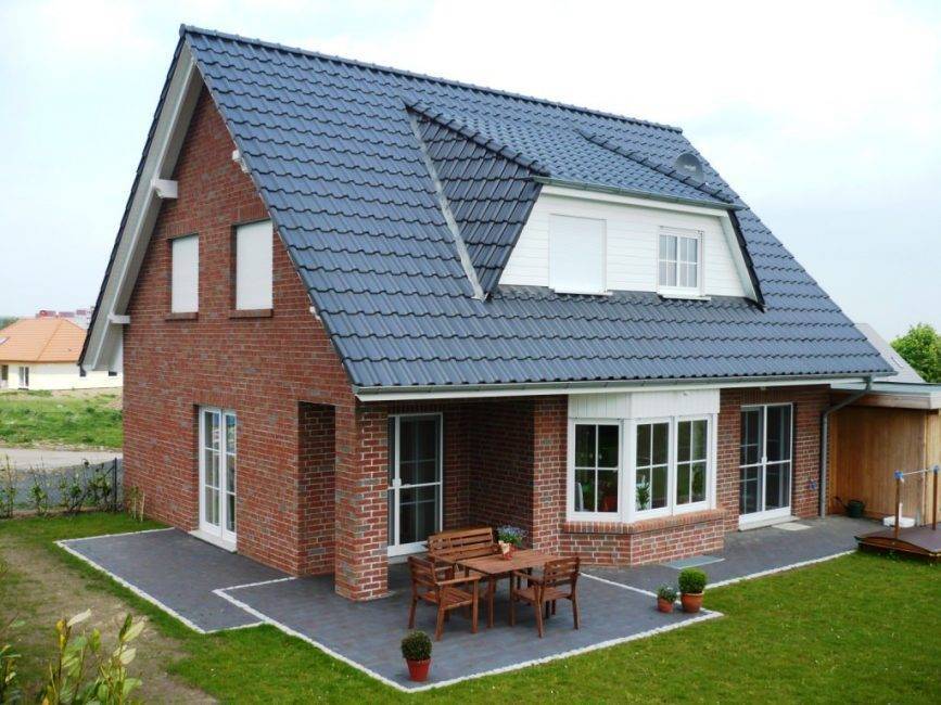 Кровля кирпичного дома по большей части делается из металлической черепицы. Она соответствует стенам по своей стилистике, хорошо удерживается ими, надежно защищает внутренний объем и очень прочна. Классические мотивы в оформлении фасада выражаются при помощи использования колонн и арок. Наилучшую совместимость с кирпичом демонстрируют ЛКМ на основе латекса или портландцемента, но под них должна быть использована грунтовка. Только такое сочетание подходит для длительной эксплуатации.