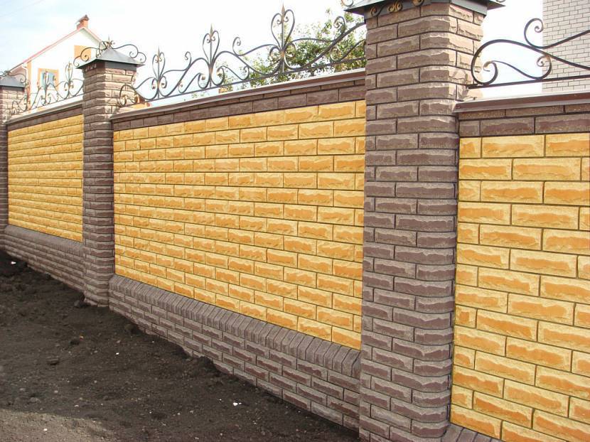 В сравнении с заборами из одного профлиста такие конструкции считаются более надежными и привлекательными, максимальный декоративный эффект достигается при облицовке внешних стен дома одинаковым кирпичом. К преимуществам также относят возможность установки опор своими силами без привлечения спецтехники, долговечность до 50 лет и закрытие участка от собак и мелких животных. Предлагаемый современный ассортимент позволяет реализовать любую идею, особенно эффектно выглядят марки, имитирующие натуральный камень или древесину. Пришедшие по каким-либо причинам в негодность пролеты легко заменить.