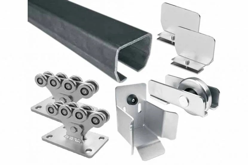 Эффективная эксплуатация подвижной секции невозможна без набора фурнитуры, куда входят: направляющая балка (рельс), консольные блоки (роликовые каретки/опоры), накатной или концевой ролик, заглушки. Когда выбираются комплектующие, нужно учитывать общий вес полотна раздвижных ворот