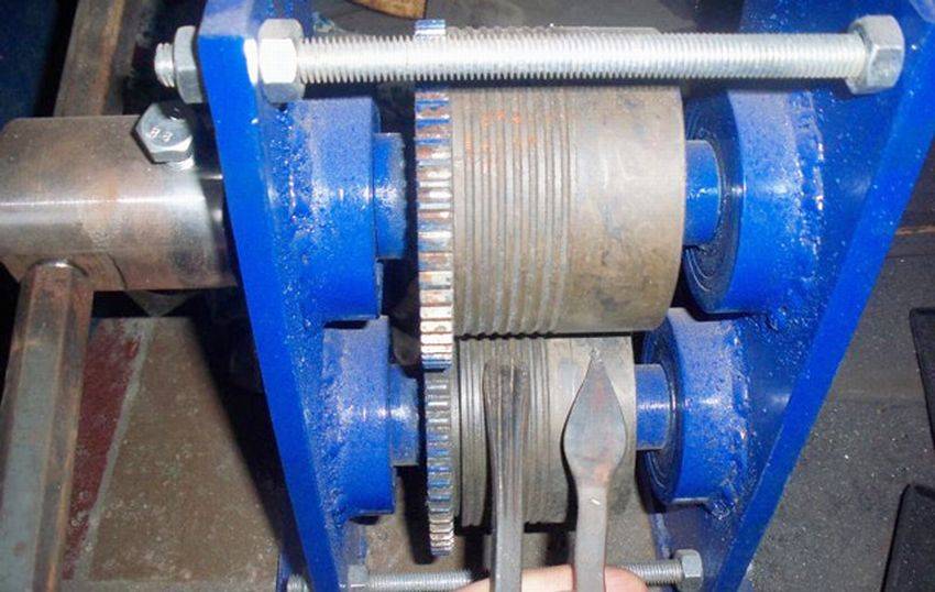 На место конца спирали надевают лекальные тиски, которые, выполняя обороты, изготавливают витки. Один оборот равен одному витку. Стоит отметить, что после завершения работы тисков, готовое изделие необходимо рихтовать. Для этого используют шлифовальную машинку.