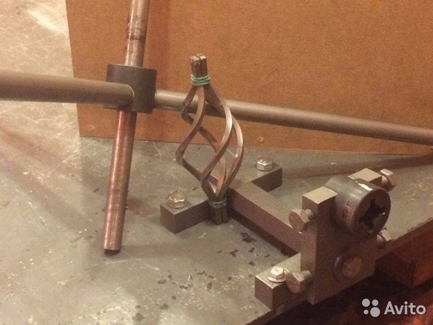- Чтобы прутья узора имели красивую витую форму, их закручивают на станке «торсион». Каждую из заготовок надо прокрутить одинаковое количество раз, чтобы они были одинаковыми.