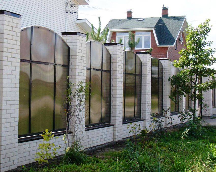 А также стоит отметить недешевую стоимость заборов из поликарбоната. Цена на такие конструкции зависит от многих факторов, но чаще всего она выше, чем на стандартные ограждения. Это связано с тем, что зачастую ПКБ комбинируют с металлической ковкой, кирпичом и деревянными элементами.