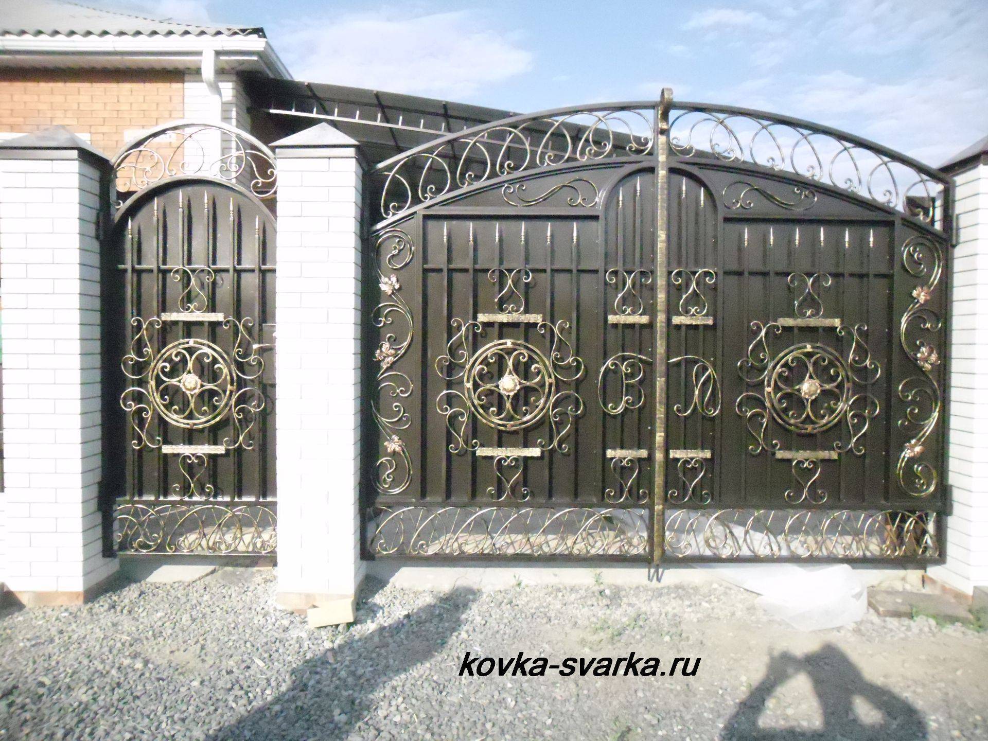 Второе — это вариант открывания ворот. Это могут быть автоматические ворота или механические. Автоматические сильно упрощают жизнь, так как для их открытия достаточно нажать кнопку. Но цена на такие кованые ворота будет высокой.