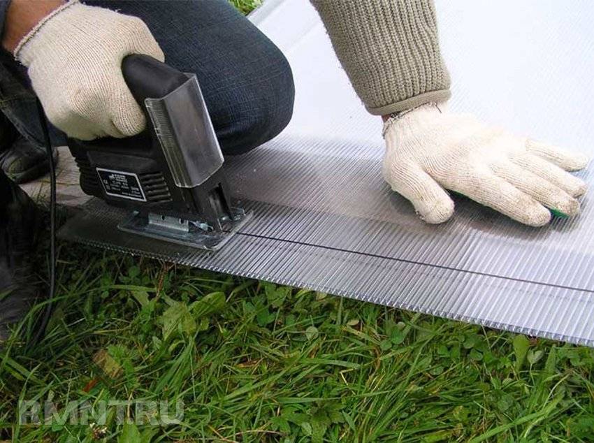 Имея требуемые размеры листов, лучше заранее выполнить их резку. Делают это с помощью электролобзика с полотном для дерева, небольшой болгаркой с диском по металлу. Но если толщина поликарбоната не превышает 10 мм, получится справиться и обычным канцелярским ножом, как показано на фото.
