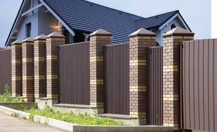 При всем многообразии цветов для сооружения оград большой популярностью пользуется лишь коричневый и бордовый, а также все их оттенки. Так происходит потому, что они хорошо смотрятся вместе со столбами, сложенными из кирпичей или камней.