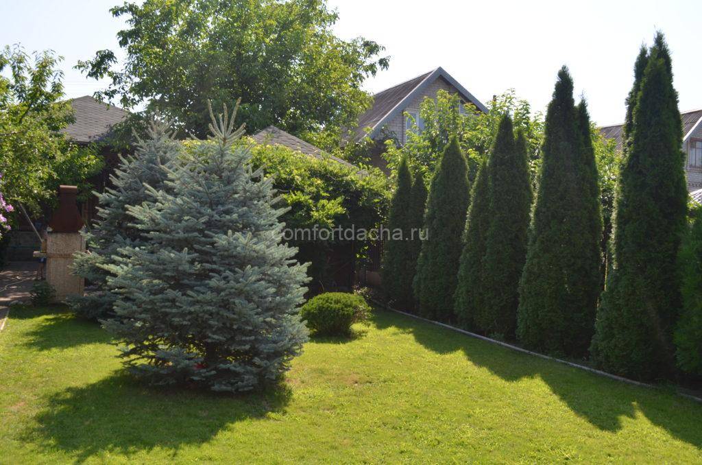 - Высаживайте на участке невысокие плодовые и декоративные деревья. Такие деревья, как например, тополь, акация или груша под 20 метров в высоту будут выглядеть нелепо на фоне одноэтажного дома. Сегодня достаточно выведено культур, как плодовых, так и декоративных, которые имеют небольшие размеры. Часто урожая с трёхметровых плодовых деревьев оказывается больше, чем с высокорослых деревьев.