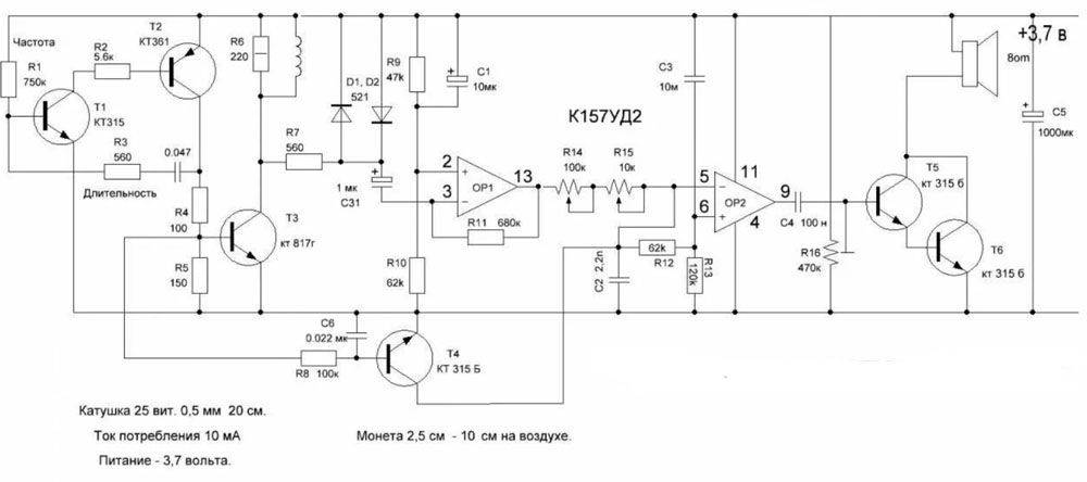 Первый транзистор создает задающий генератор, второй – поисковый генератор. Если к катушке приблизить металл, в наушниках появляется звук. Подробная схема приведена ниже.
