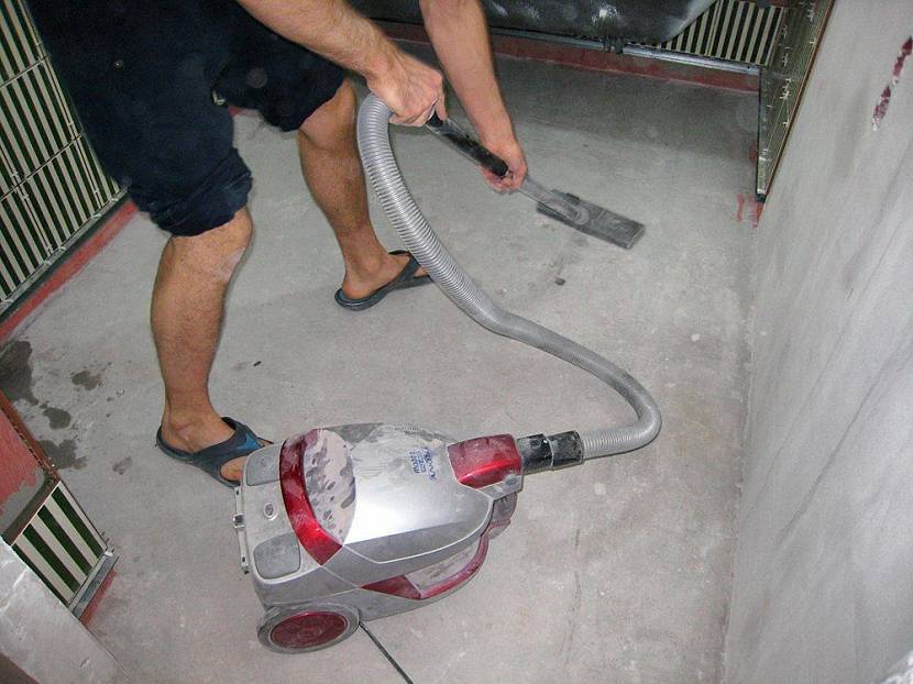 После того, как цемент, которым вы исправляли неровности высохнет, основу нужно очистить. Уберите весь мусор и пыль.