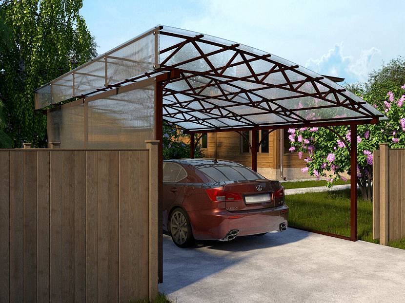 Конструкция деревянного навеса из поликарбоната может быть выполнена в различных вариантах: