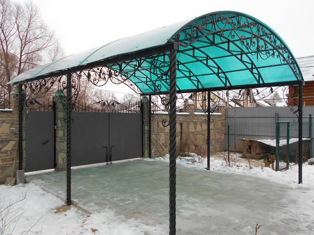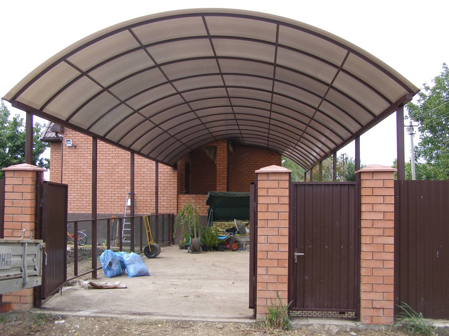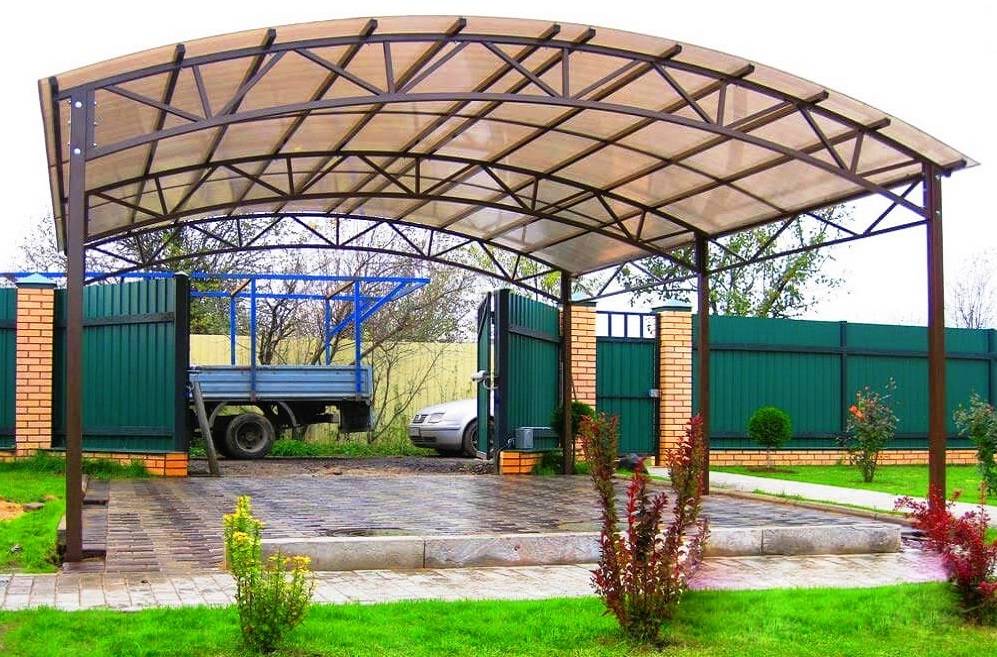 Для изготовления подобных навесов используется поликарбонат — легкий и гибкий материал, способный выдерживать немалые нагрузки и не затеняющий пространство под крышей.