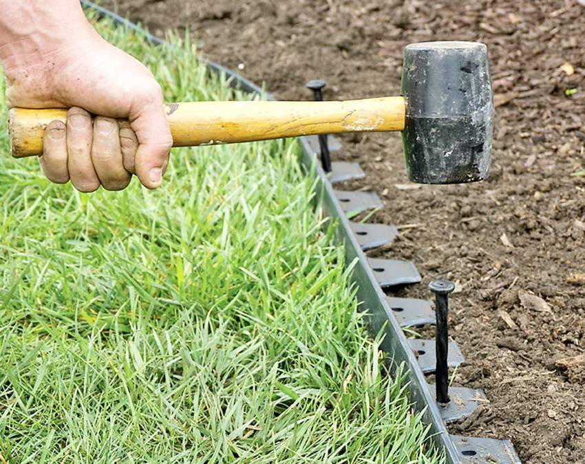 Монтаж ограждающих лент может производиться двумя способами, наземным и с заглублением. Первый способ используется для обустройства приподнятых грядок и многоярусных клумб. Для фиксации ленты по периметру в этом случае применяют специальные пластиковые колышки. Торцы ленты, замыкающейся в кольцо (правильной или неправильной формы) скрепляют степлером.