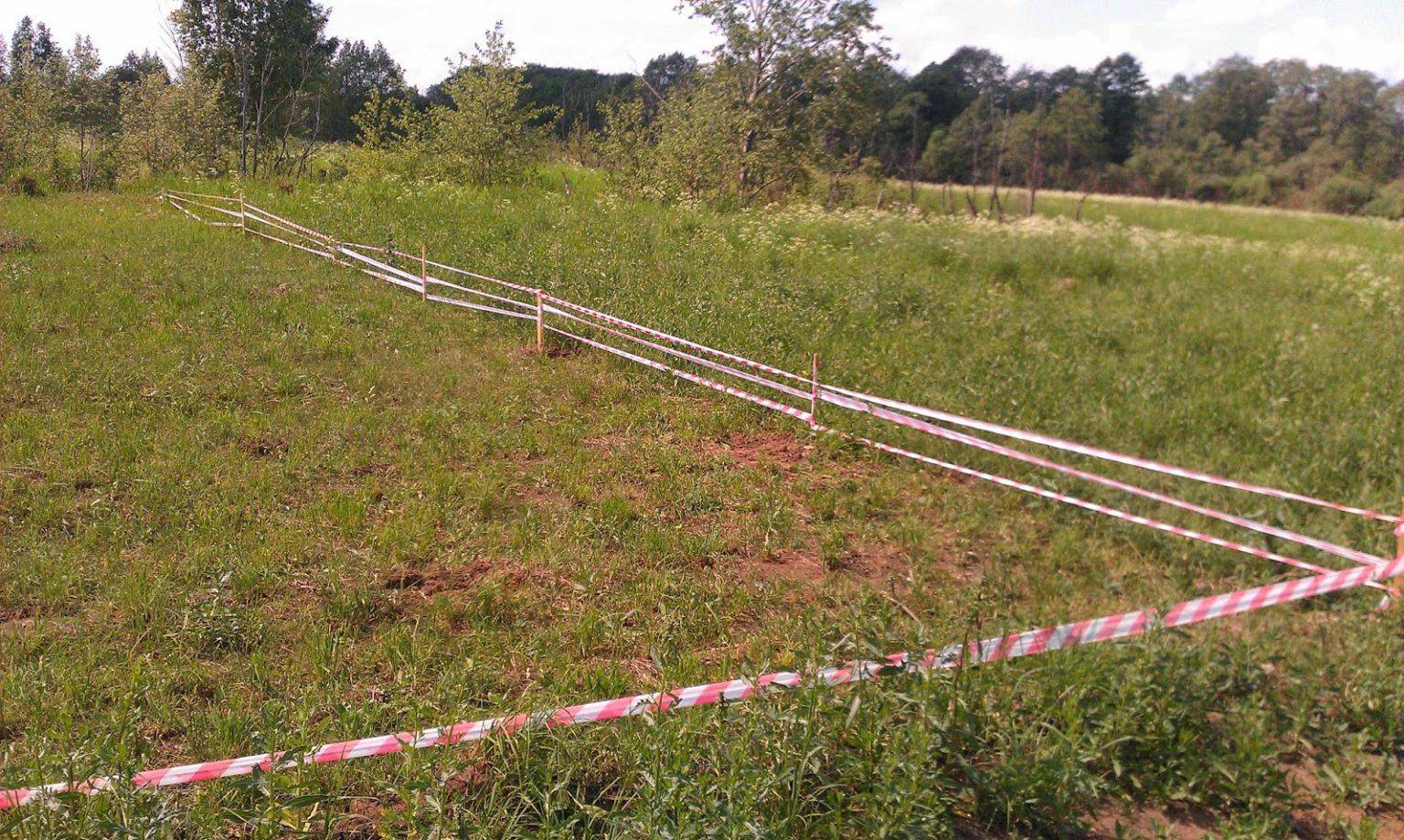 Строительство сетчатого забора начинают с разметки периметра, вбивая деревянные колышки по углам будущего ограждения. Затем их соединяют шнуром, в места установки опор тоже забивают колышки.