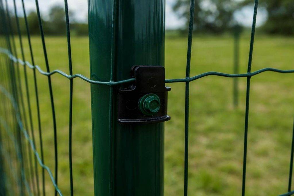 Иногда секции из сетки с полимерным покрытием приваривают к пластинам или даже сразу к столбам. Предусмотрены, также, специальные крепёжные элементы. Это различные скобы, хомуты, винты. Всё это может поставляться в комплекте с сетками.