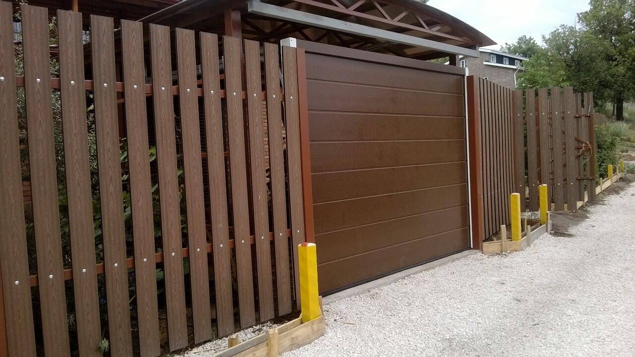 На заметку! Иногда их изготавливают из металлических труб с последующей облицовкой панелями из ДПКТ. В результате получается однородное и весьма привлекательное ограждение.