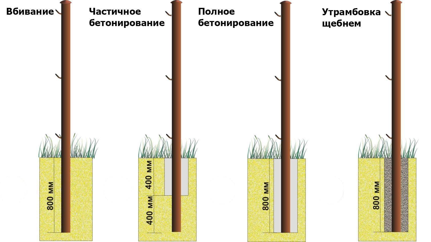 Опоры делают из дерева, бетона, асбоцементных труб, кирпича, винтовых свай. Оптимальным решением будет установка столбов из стальных прямоугольных труб размером 60×30, 60×40 мм или круглых, диаметром 5 — 6 см. Для улучшения устойчивости к нижней части приваривают прутки.